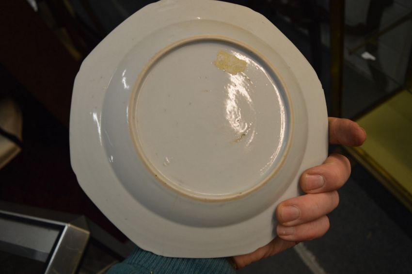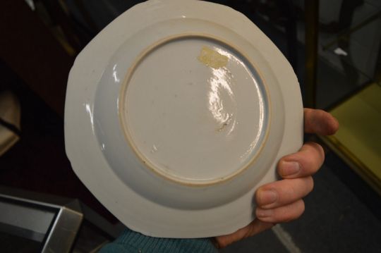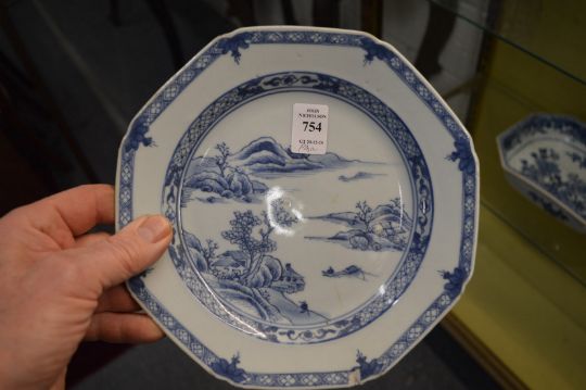 A pair of Chinese hexagonal shaped blue and white plates, one cracked and chipped.