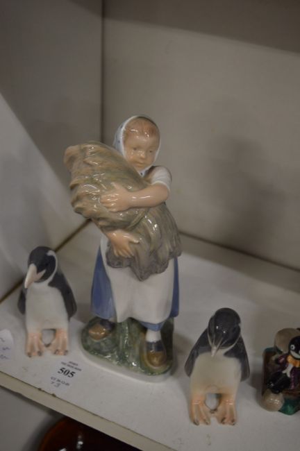 Copenhagen figure of a girls holding a sheaf of corn together with a pair of penguins, one beak chipped.