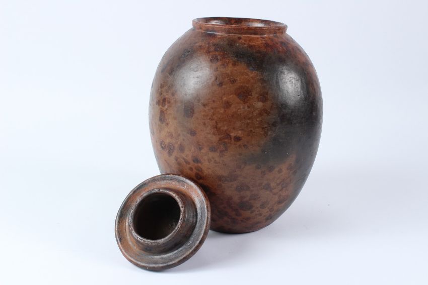 AN AFRICAN MOTTLED BROWN GLAZED EARTHENWARE JAR AND COVER.