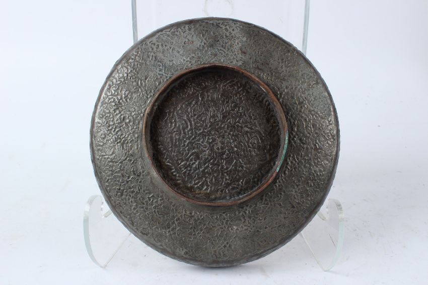 A 19TH CENTURY OR EARLIER ENGRAVED ISLAMIC COPPER DISH with fine calligraphy.