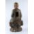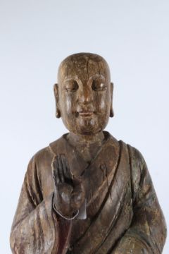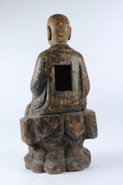 A LARGE CARVED WOOD FIGURE OF A BUDDHIST MONK, Ming Dynasty (1368 - 1644), modelled seated on a rockwork base wearing an ample robe falling in folds around his feet.