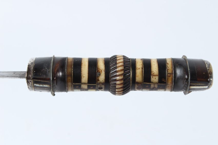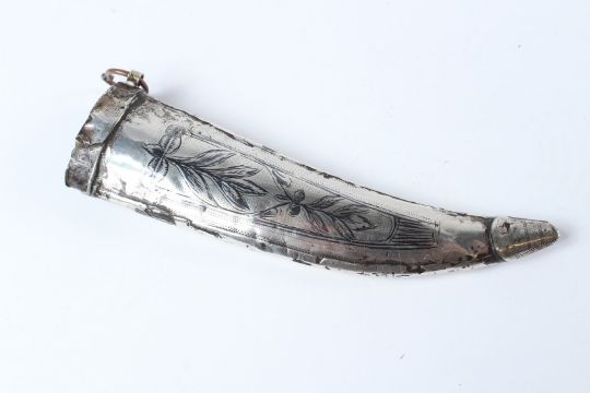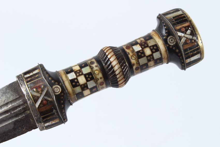A FINE 19TH CENTURY SYRIAN OR IRAQI DAGGER with inlaid horn hilt and niello inlaid silver scabbard. 27cms long.
