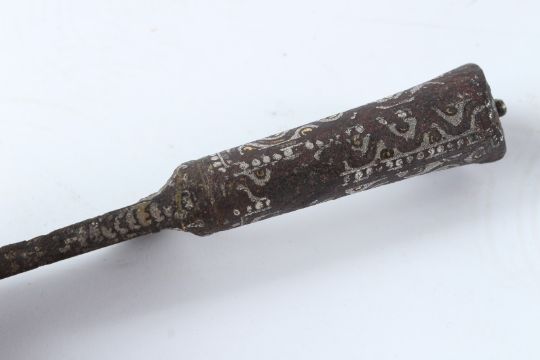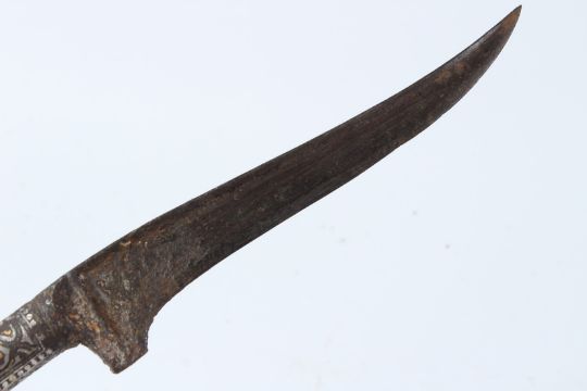 AN 18TH - 19TH CENTURY INDIAN SILVER AND GOLD INLAID DAGGER.