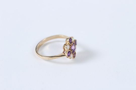 A 9CT GOLD AMETHYST AND OPAL RING.