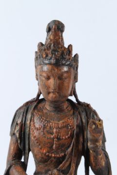 A LARGE LACQUER WOOD FIGURE OF GUANYIN, Qing Dynasty (1644 - 1912), modelled seated wearing flowing robes and with an elaborate headdress.