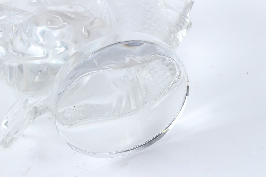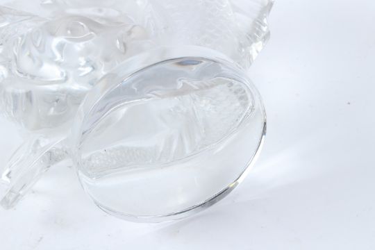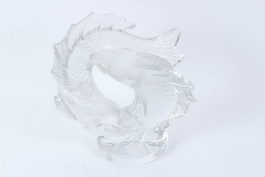 A LALIQUE FROSTED AND CLEAR GLASS SCULPTURE, modelled as two entwined fish, engraved signature to the base.
