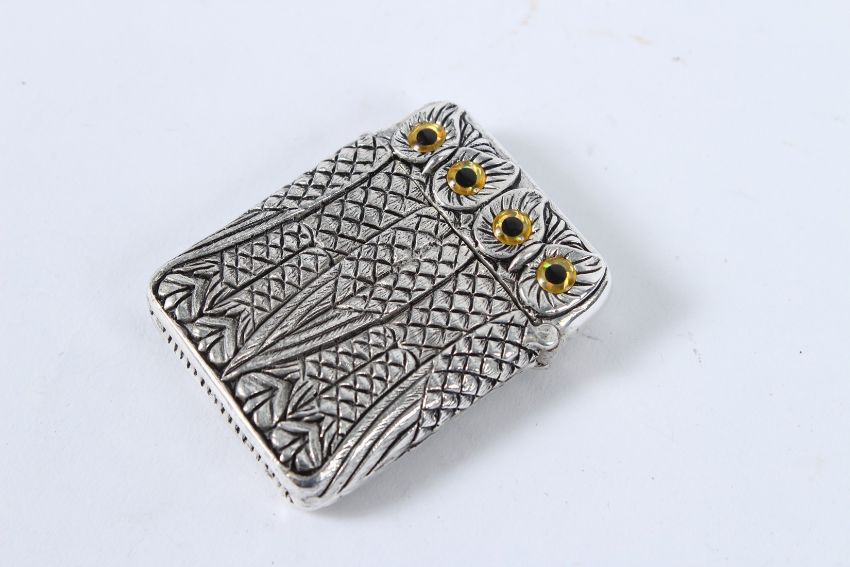 A SILVER PLATED DOUBLE OWL VESTA CASE.