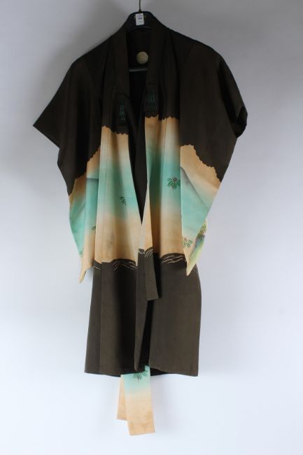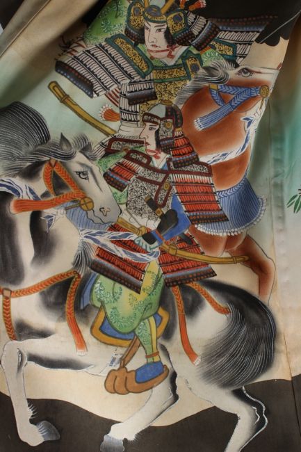 A JAPANESE BLACK SILK ROBE, 20TH CENTURY, painted to the reverse with Samurai on horseback.