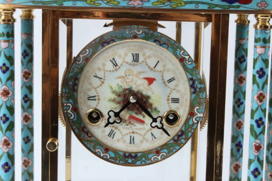 A DECORATIVE CLOISONNE AND GILT BRASS MANTLE CLOCK, with painted dial.