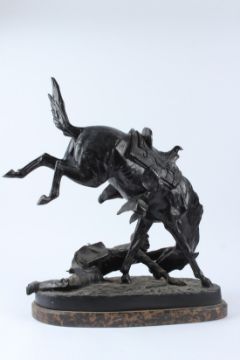A GOOD BRONZE GROUP OF A MAN DISMOUNTED FROM HIS BUCKING STALLION, signed and numbered 17/500, on a marble base.