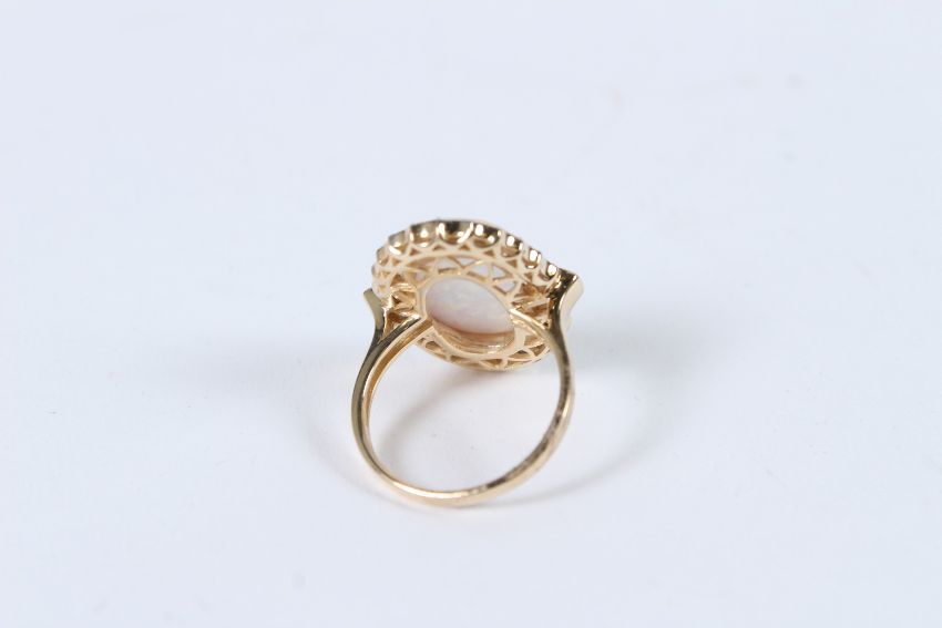 A 9CT GOLD OPAL AND DIAMOND RING.