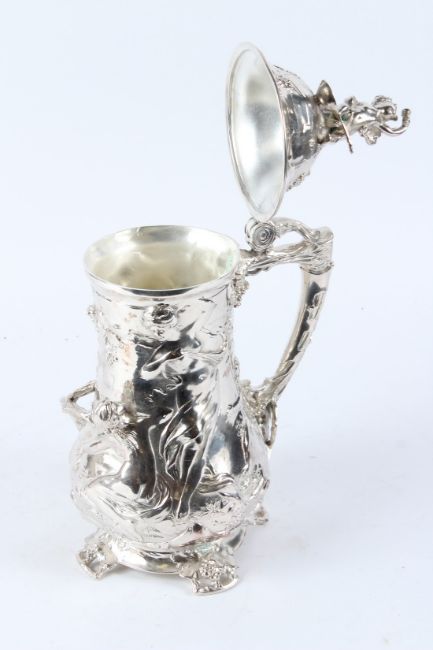 IN THE MANNER OF WMF, A PLATED STEIN WITH FIGURAL DECORATION.