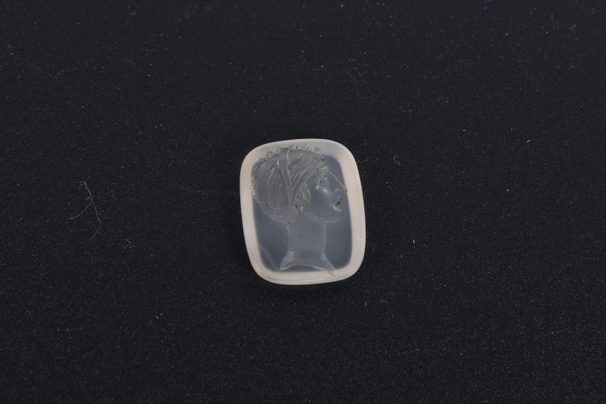 A SMALL CARVED ROCK CRYSTAL featuring the head of a king.