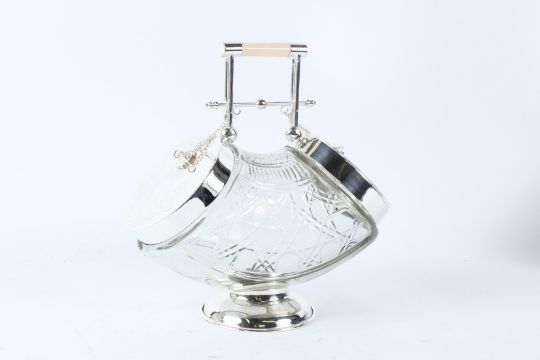 A PLATED AND CLEAR GLASS DOUBLE ENDED BISCUIT BARREL.