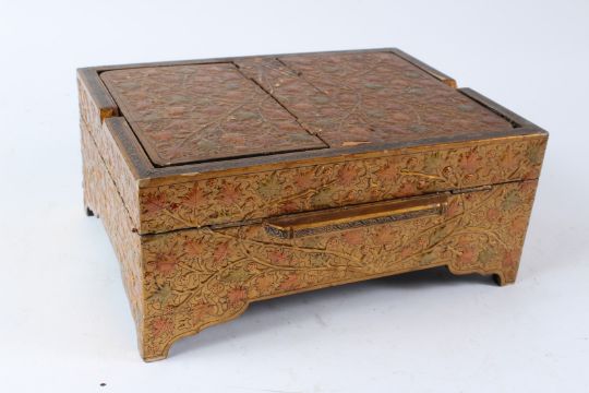 A FINE AND UNUSUAL INDIAN KASHMIRI PAINTED AND LACQUERED QURAN BOX AND STAND.