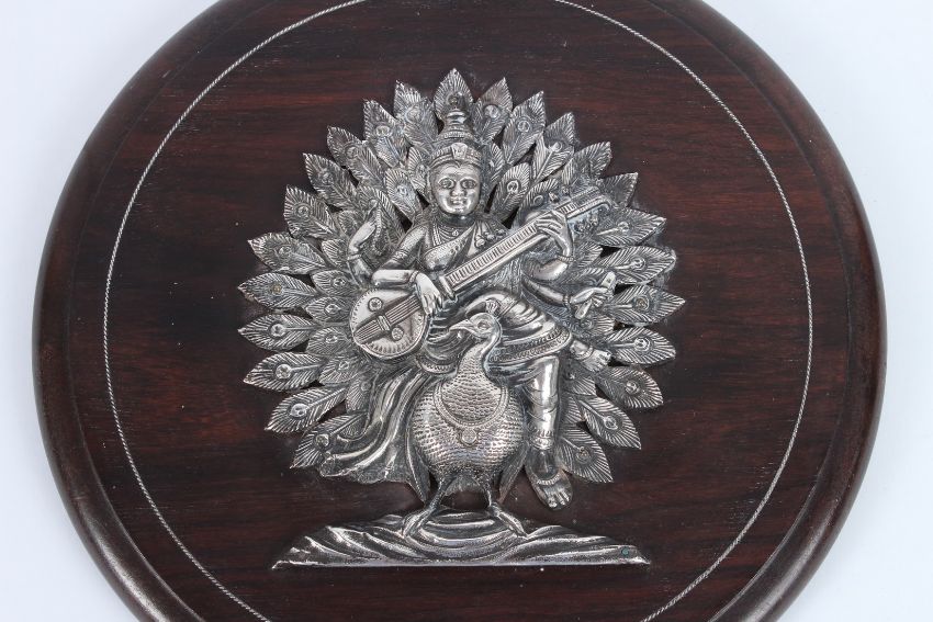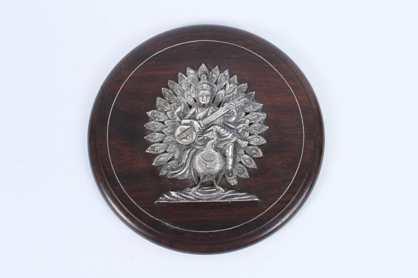 A FINE INDIAN SILVER HINDU DEITY on a wooden plaque.