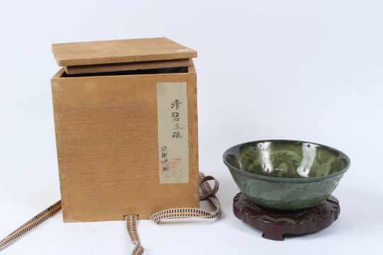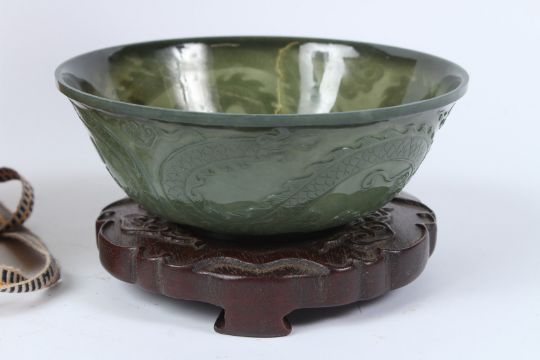 A QING DYNASTY SPINACH GREEN JADE DRAGON BOWL and hardwood stand, with collection wooden box.