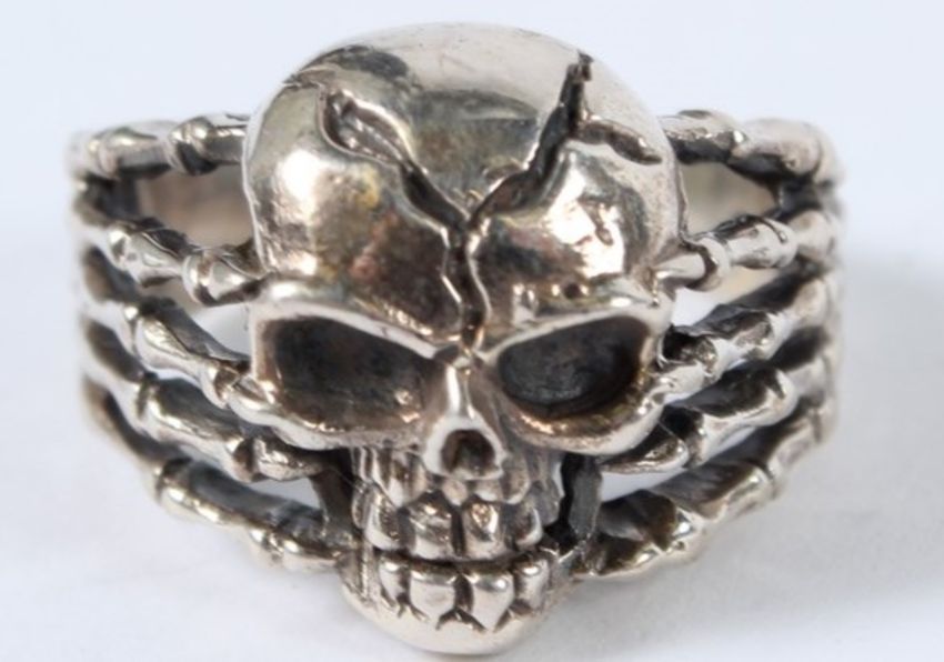 A SILVER SKULL HEAD RING.