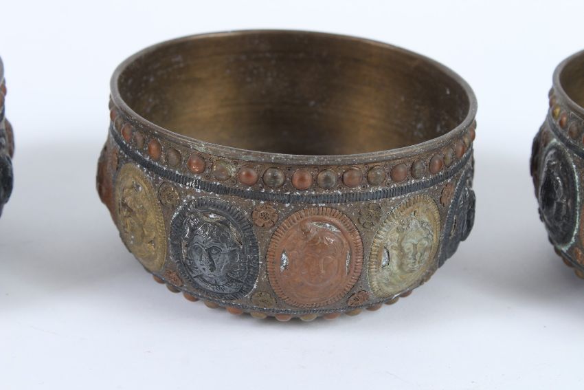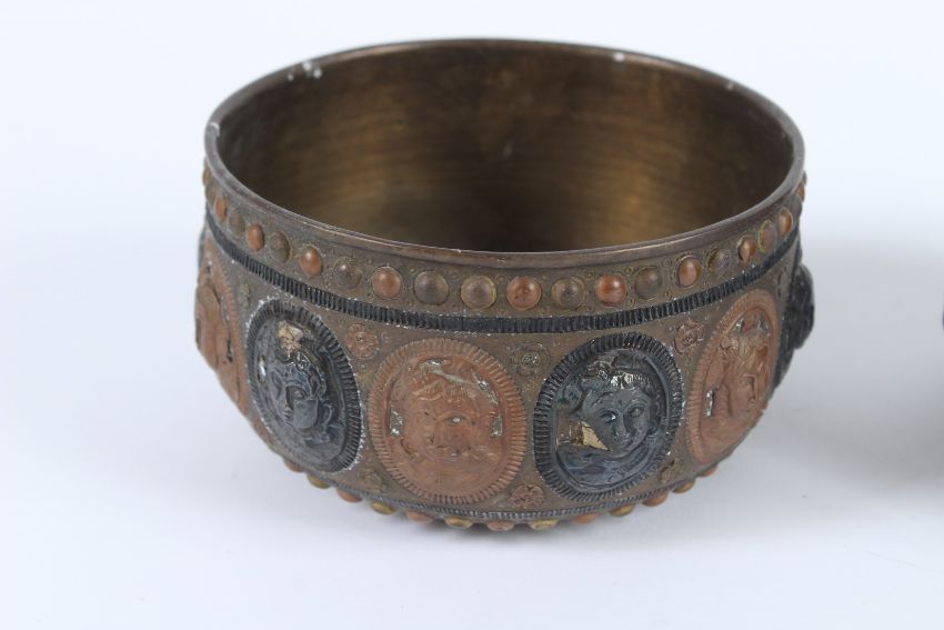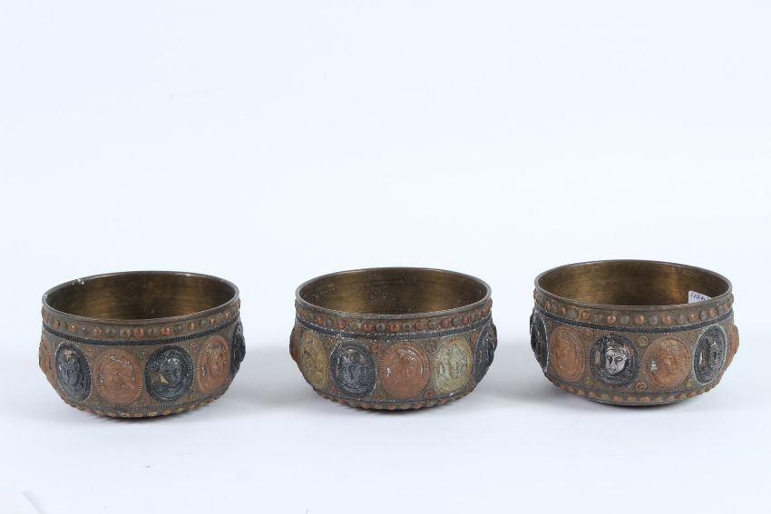 THREE 19TH CENTURY INDIAN TANJORE SILVER AND COPPER INLAID BRASS BOWLS with figural decoration.
