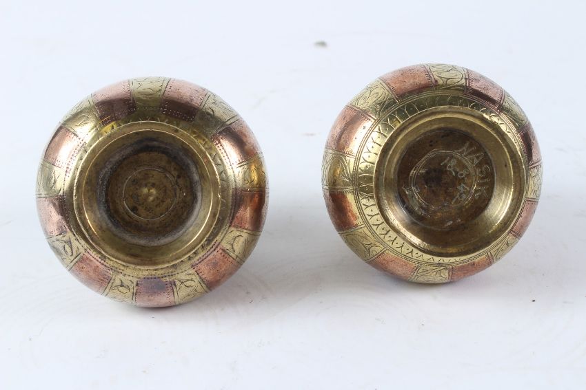 TWO 18TH CENTURY SOUTH INDIAN TANJORE GANGA JUMNA COPPER AND BRASS LOTA VESSELS.
