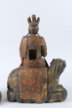 A PAIR OF LACQUER WOOD FIGURES OF SIMHANADA AVALOKITESVARA, late Ming / Qing Dynasty, one modelled seated on an elephant, the other a Buddhist lion, each resting on a naturalistic base.