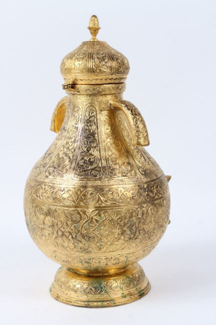 A VERY GOOD TURKISH OTTOMAN GOLD ON COPPER SERBETLIK "TOMBAK" with finely etched panels, the lid with an acorn finial, two handles and spout with top.