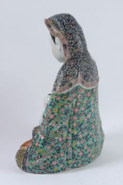 A CHINESE PORCELAIN STATUE OF GUANYIN holding a baby and a calligraphy tablet, with famille rose robe.