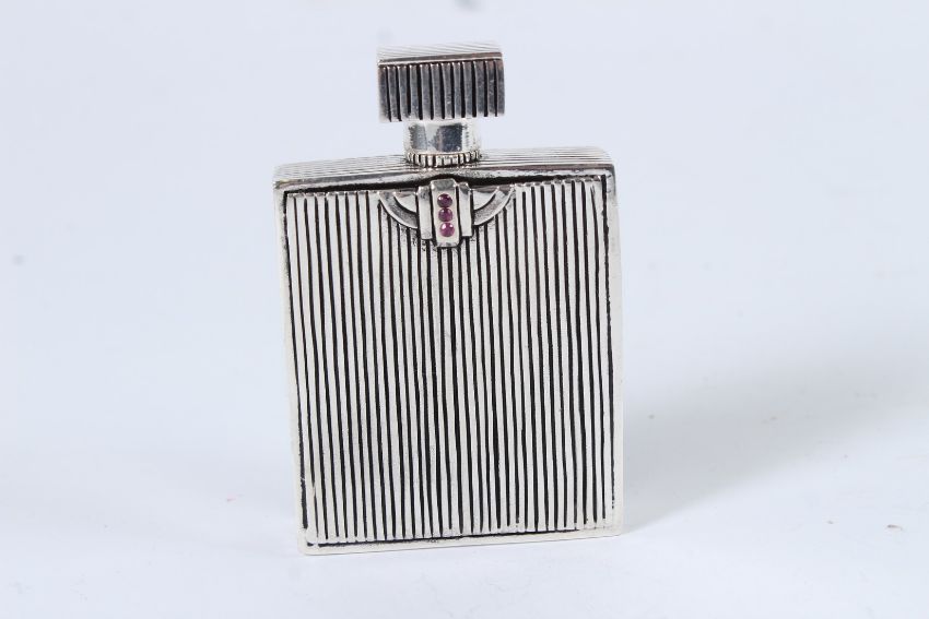 A SILVER PLATED ART DECO LADY ENAMEL RUBY SET PERFUME BOTTLE.