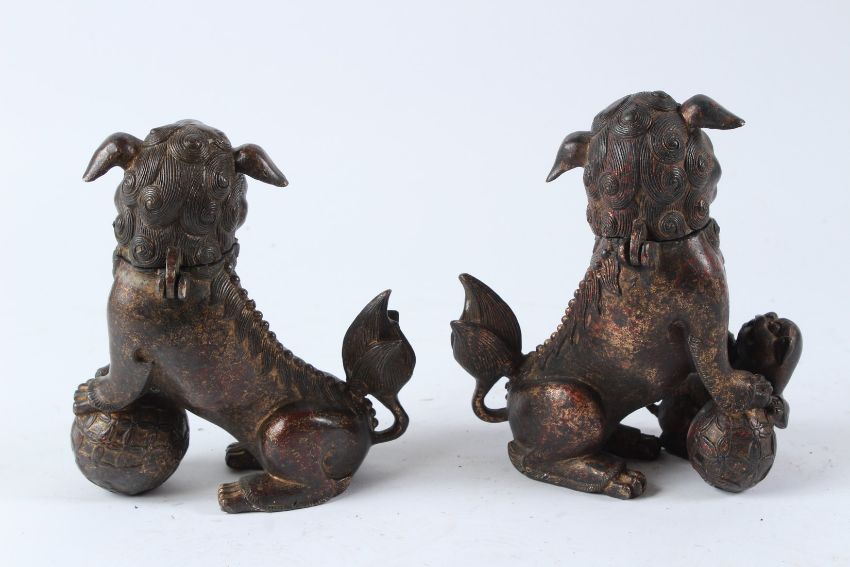 A FINE PAIR OF CHINESE GILDED BRONZE LION SHAPED INCENSE BURNERS.