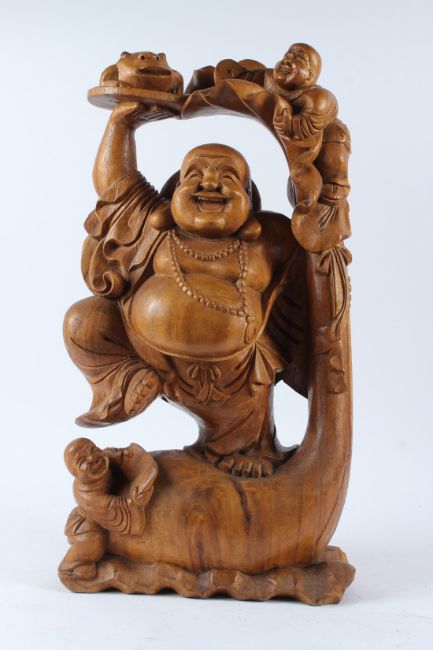 A LARGE CHINESE CARVED WOOD FIGURE OF A HAPPY BUDDHA, with two boy attendants and a frog.