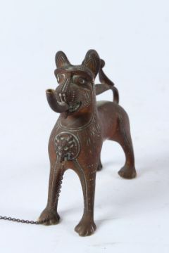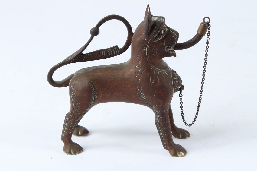 A RARE, POSSIBLY ISLAMIC, LION SHAPED BRASS OR BRONZE OIL LAMP.