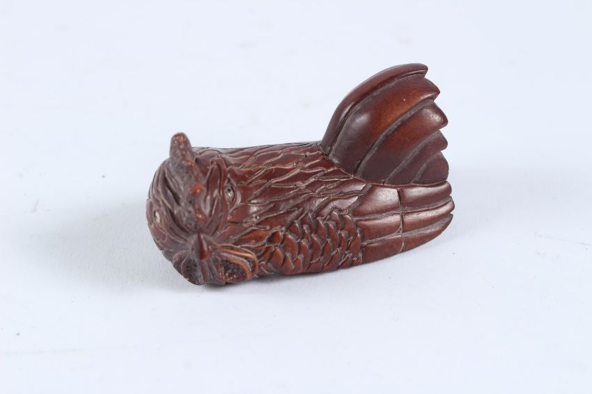 A CARVED WOOD CHICKEN NETSUKE.