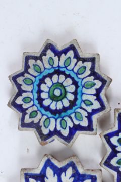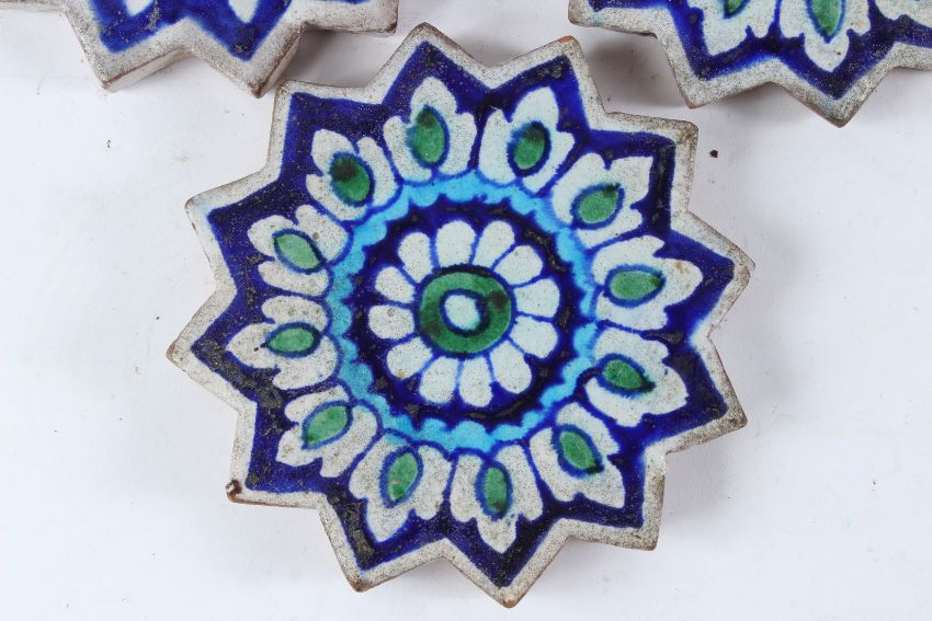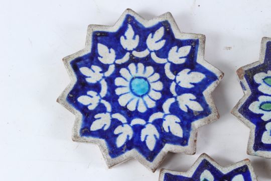 A SET OF THREE 19TH CENTURY INDIAN MULTAN STAR SHAPED TILES.
