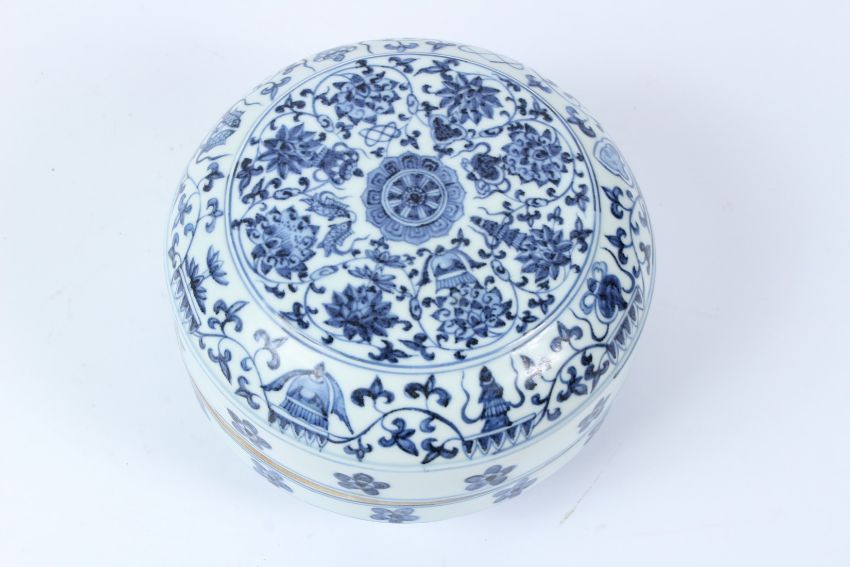 A CHINESE BLUE AND WHITE "LOTUS" PORCELAIN BOX.