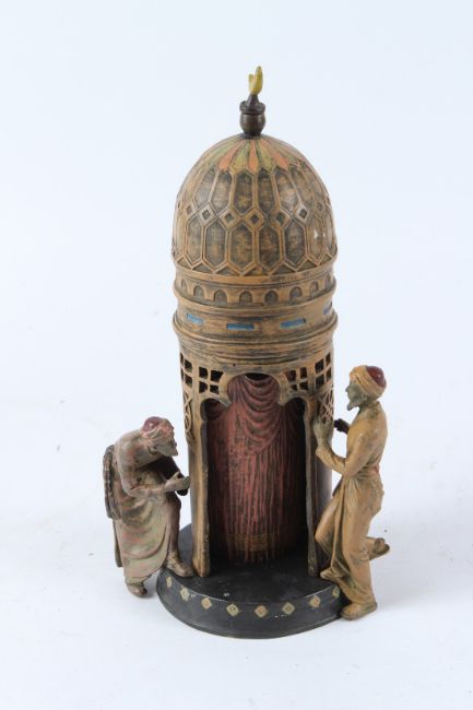 A VIENNA STYLE COLD PAINTED BRONZE GROUP OF ARAB FIGURES BY A TOWER.