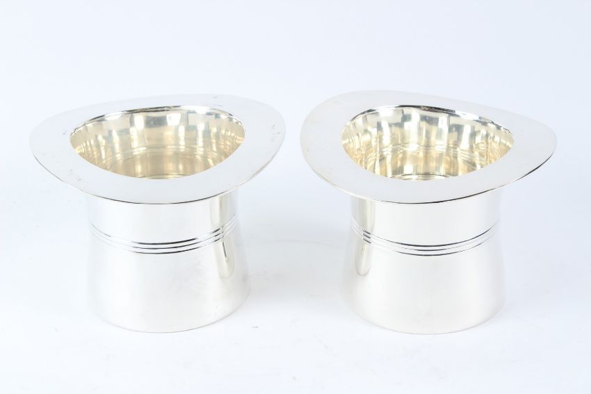 A PAIR OF POLISHED METAL TOP HAT SHAPED WINE COOLERS.