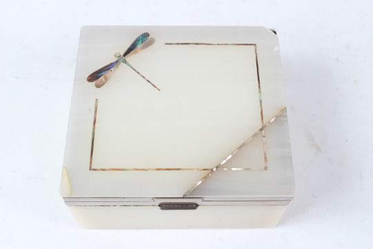 A GOOD ART DECO ONYX CIGARETTE BOX, with silver hine and mounts, the hinged cover inlaid with a dragonfly.