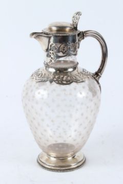 A GOOD SILVER MOUNTED GLASS CLARET JUG.