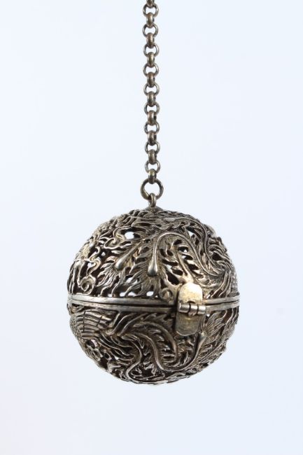 A CHINESE WHITE METAL INCENSE HOLDER BALL.