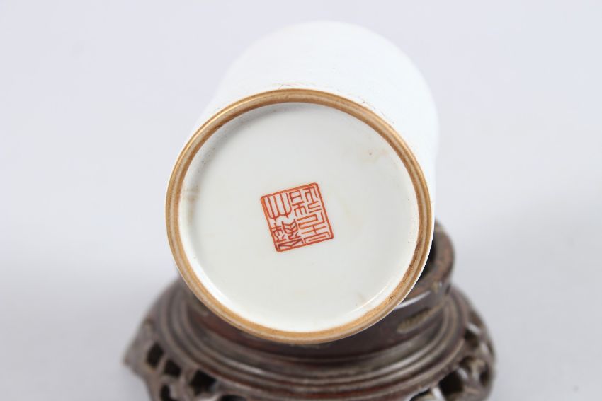 A GOOD SMALL CHINESE PORCELAIN SPILL VASE ON HARDWOOD STAND, the vase painted with a scholar on an ox, red seal mark to the base.