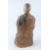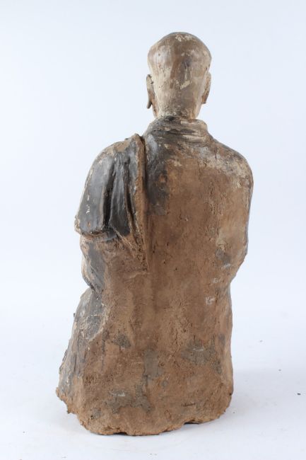A LARGE PAINTED WOOD AND STUCCO FIGURE OF A LOUHAN, Ming Dynasty (1368 - 1644), modelled seated wearing a long flowing robe and holding a staff in both hands.