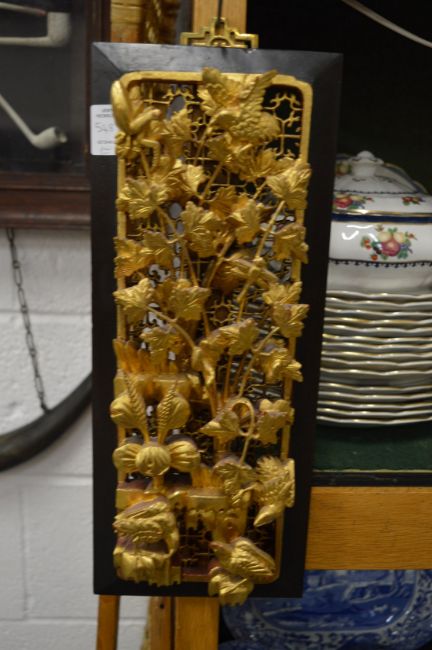 A pair of Chinese carved and pierced wooden plaques with gilded decoration.