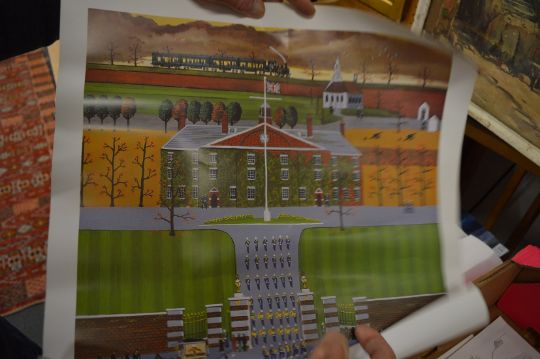 A group of unframed prints.