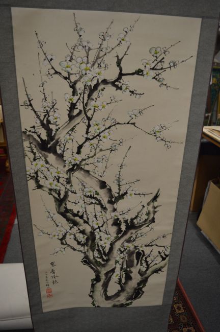 A group of five 20th century Chinese scroll paintings, four with original boxes.