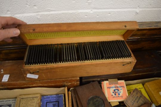 A good Victorian brass and mahogany slide projector, converted to electricity complete with numerous boxes of slides and accessories etc.