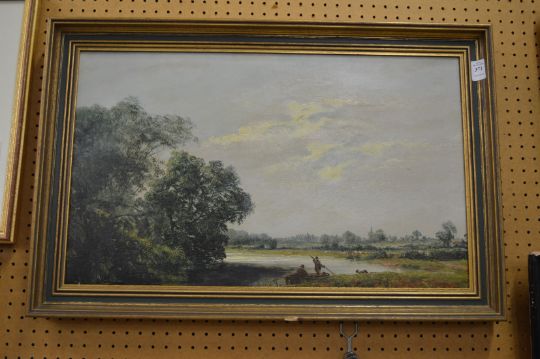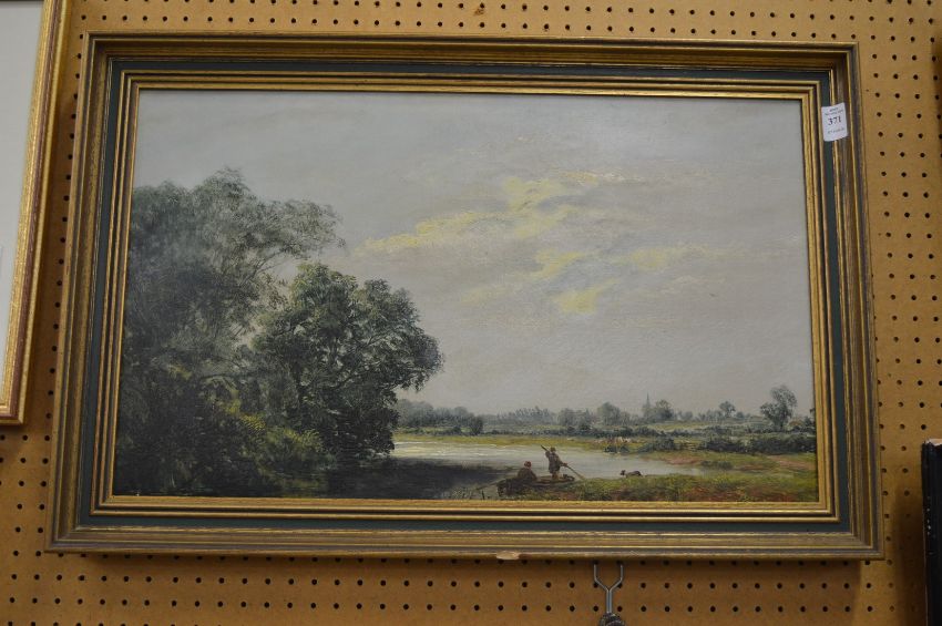 Circle of F W Watts, figures in a rowing boat with an open landscape beyond, oil on board.