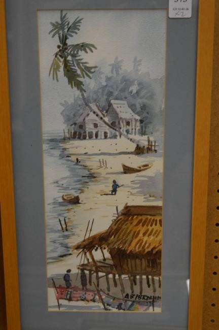 Abu Bakar Ibrahim, figures on a Malaysian beach, watercolour and a watercolour of fishing boats by another hand.