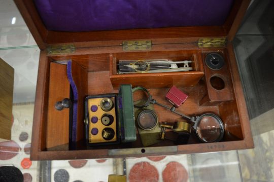 A good brass microscope with original mahogany box and accessories.