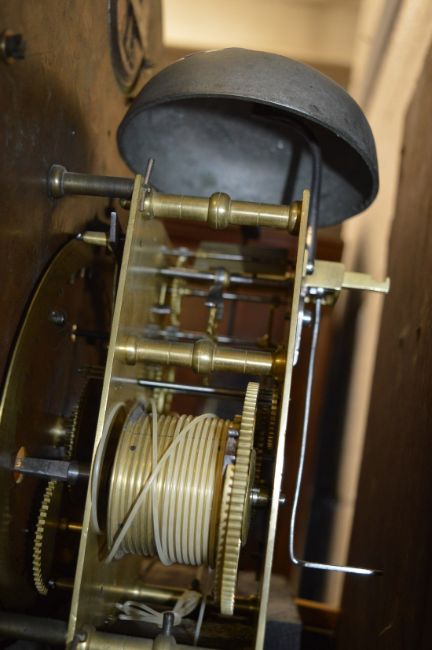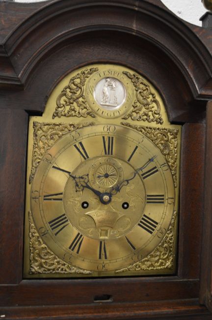An 18th century oak longcase clock with eight day movement, the arch shaped brass dial signed James Pepper, Biggleswade.
