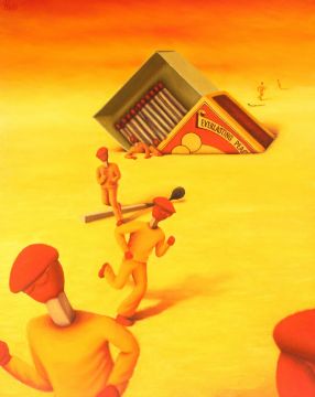 THEO LEERING (CONTEMPORARY) Match figures and matchbox oil on canvas signed 99 x 79cm